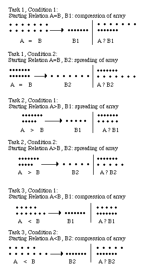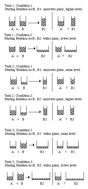 Figure 3: Conservation of discontinuous material (pearls) Procedure: Each group of subjects were required to solve conservation tasks of a certain content: number, discontinuous material (pearls), or continuous material (water). Because every task contained 3 conditions, each child was required to solve 3 tasks of the same kind. Within each group, the order of the tasks was counterbalanced across subjects. Scoring: The same scoring system used in Experiment 1 was applied to the data from Experiment 2. As before, subjects were classified into one of eight possible categories. Results Table 3 shows the number of children who fall into each of the eight possible scoring categories. As can be seen from table 3, the performance of most children can be described as homogenous. Within the group of children given conservation of number tasks, 77 out of 98 children (78.6%) show homogenous performance, as did 81 out of 100 children (81.0%) given the conservation of quantity (pearls) tasks, and 81 out of 102 children (79.4%) given the conservation of quantity (water) tasks. In all, 239 of the 300 children tested (79.7%) displayed homogeneous performance (category 1 or 8). Moreover, the percentage of children who show homogeneous performance is almost equal across the three groups. Table 3: The number of children classified in each of the eight possible categories.